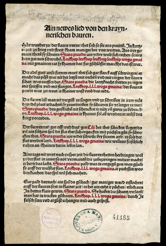letak iz leta 1515, v katerem so prve slovenske tiskane besede: Stara pravda ter le vkup, le vkup, le vkup, voga gmaina
