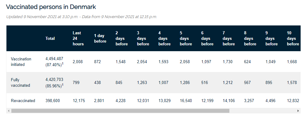 Vsekakor je zanimivo, da je pred petimi (5.) dnevi slovenski portal 24.ur.com poročal, da je na Danskem sicer precepljenih 76 odstotkov ljudi, da pa je življenje tam povsem enako kot pred prvim izbruhom covida. Objavljeni podatki STA in 24.ur.com se razlikujejo za slabih 10 odstotkov cepljenih, kar je preveč, da bi toliko prebivalcev lahko cepili v petih dnevih.