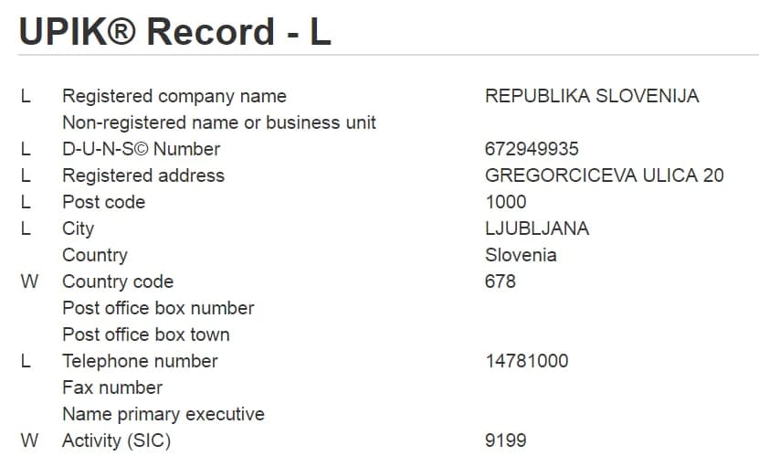 REPUBLIKA SLOVENIJA je kot korporacija ali podjetje registrirana tudi v Unique Partner Identification Key pri Dunn and Bradstreet (D&B), njena D-U-N-S© Number pa je 67-294-9935. Zanimivo je, da je kot številka oziroma koda države (country code) navedena številka 678. Po standardu ISOI 3166, prestavlja številka države 678: São Tomé and Principe, ki je otok v Atlantiku, zahodno od obale Afrike, za katerega je znano, da je bil med prvimi ozemlji pod nadzorom Portugalske in Vatikana, ki so v srednjem veku izvajala trgovino s sužnji. REPUBLIKA SLOVENIJA ima po tej klasifikaciji številko 705.