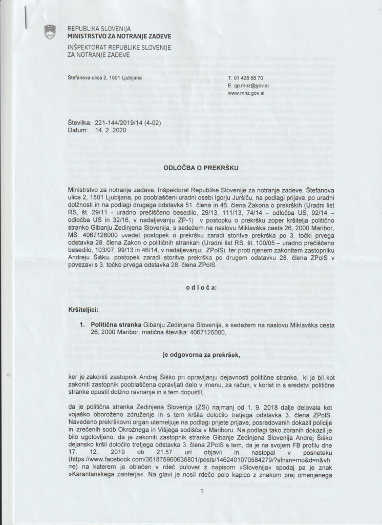 Zanimiva je zlasti argumentacija Inšpektorata RS za notranje zadeve v zvezi z očitanim dejanjem, ki se glasi: »/…/ je bilo ugotovljeno, da je zakoniti zastopnik stranke Gibanje Zedinjena Slovenija Andrej Šiško dejansko kršil določilo 3. odstavka 3. člena ZPolS s tem, da je na svojem FB profilu dne 17. 12. 2019 ob 21:57 uri objavil in nastopal v posnetku na katerem je oblečen v rdeč pulover z napisom »Slovenija« spodaj pa je znak »Karantanskega panterja«. Na glavi je nosil rdečo kapico z znakom prej omenjenega panterja. Na posnetku so za njim jasno vidni in prepoznavni simboli stranke ZSi.« V nadaljevanju v svojem govoru Šiško pove, »da je potrebno ustanoviti tudi Slovensko narodno vardo in oblikovanje deželnih vard«, kar ima Zedinjena Slovenja zapisano v 2. točki svojega političnega programa.