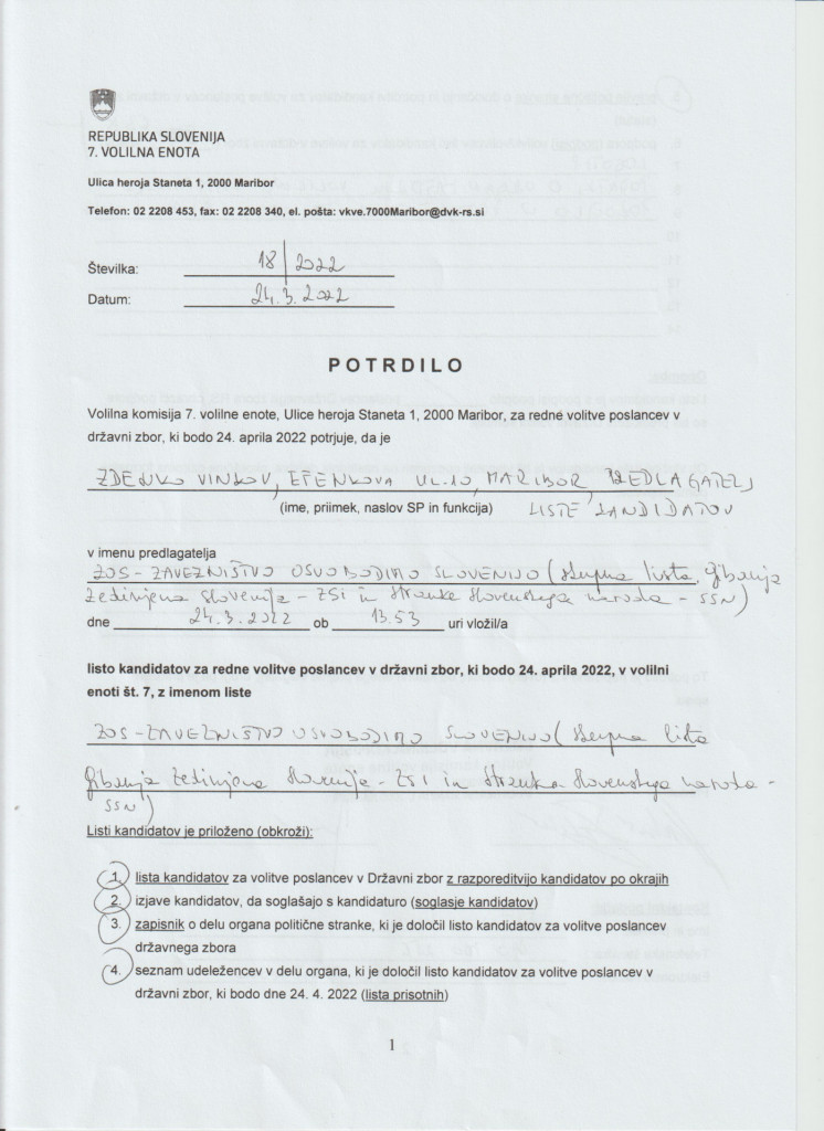 »Predsednik Volilne komisije 7. VE Maribor Branko Reisman me je poklical po telefonu, da na državnozborskih volitvah ne moremo nastopiti kot ZOS – Zavezništvo osvobodimo Slovenijo, ampak samo kot Gibanje Zedinjena Slovenija in naj nujno pridem na sedež 7. VE Maribor, da bomo popravili našo vlogo. Ker se nisem takoj odzval, me je zatem poklical še dvakrat. Vse to je bilo v petek dopoldan, 25. 03. 2022.