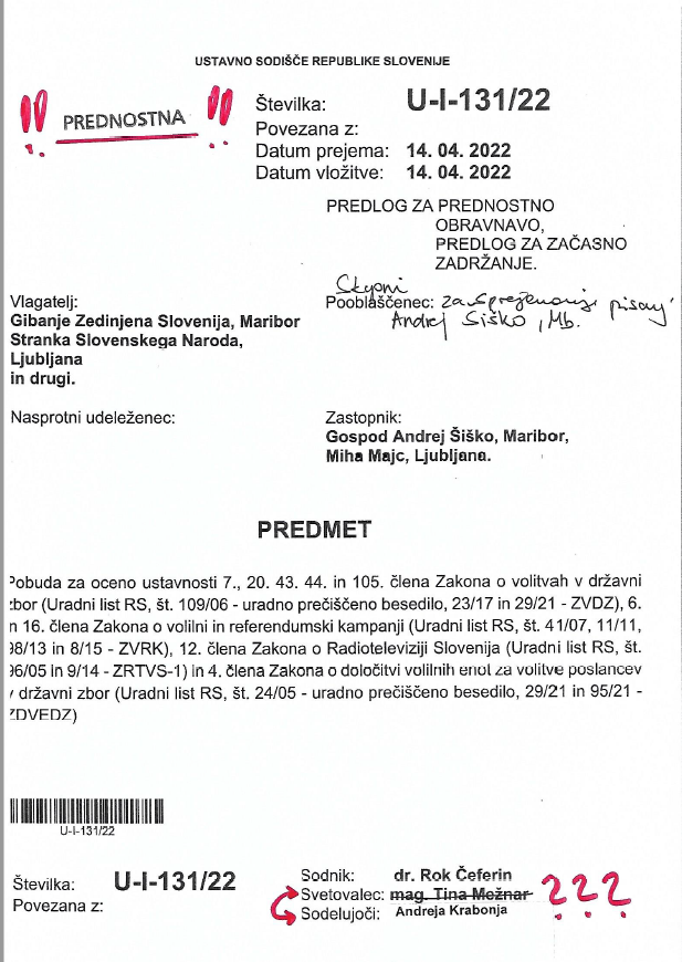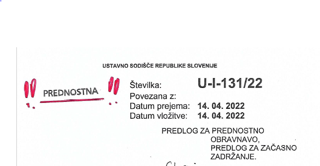 Žig sodnega osebja na ovitku sodnega spisa opr. št.: U-I-131/22 LEVO zgoraj pa neizpodbitno potrjuje in dokazuje, da bi se mora navedena zadeva na Ustavnem sodišču RS že zdavnaj obravnavati prednostno, a se zaradi nezakonitega početja sodnika Roka Čeferina ni.