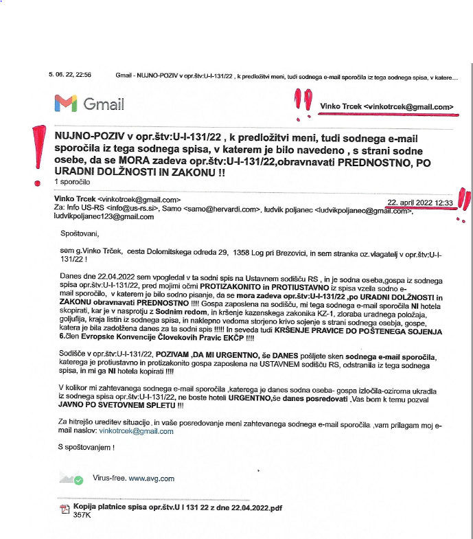 Dokumenti dokazujejo, da je navedeni že dne 22. 04. 2022 – torej še pred izvedenimi volitvami za poslance v DZ RS – po e-pošti od Ustavnega sodišča RS zahteval, da mu pošljejo listino, katero mu je pred nosom iz sodnega spisa odtujila gospa zaposlena na Ustavnem sodišču RS.