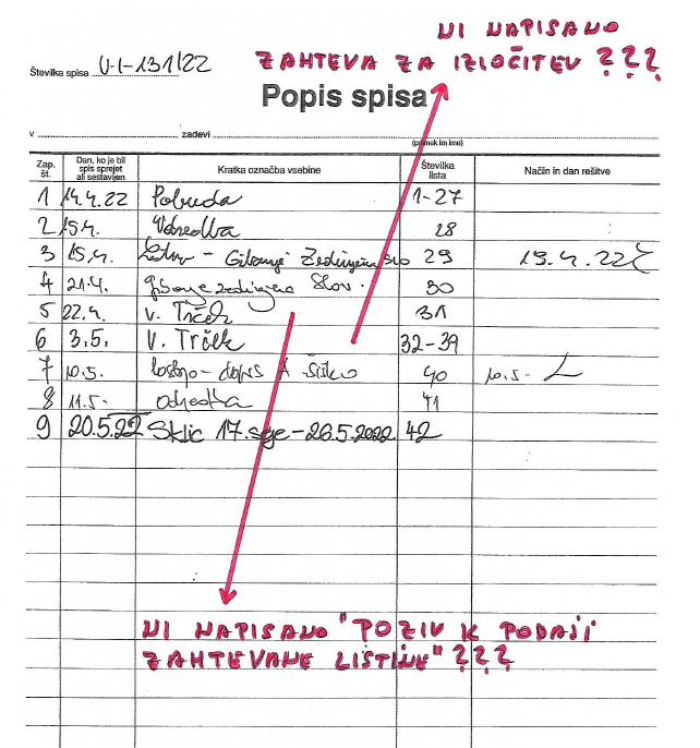 V sodnem spisu bi moralo pod zadevo z dne 22. 04. 2022 pisati POZIV k predložitvi listine, pod zadevo z dne 03. 05. 2022, pa bi MORALO pisati: ZAHTEVA ZA IZLOČITEV SODNIKA Roka Čeferina, vendar tega v sodnem spisu ni!