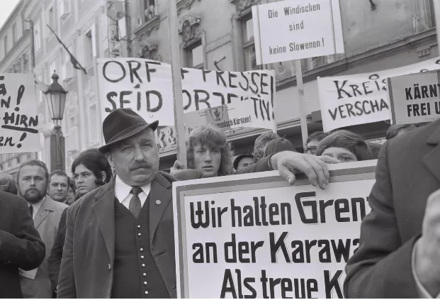 nemški protislovenski protestniki z napisi: Die Windischen sind keine Slowenen! (Vindi niso Slovenci!) in Wir halten die Grenze an den Karawanken, als treue Kärntner (Mejo držimo na Karavankah, kot zvesti Kärntnerji). Obrazložitev zapisa Kärntnerji - to niso in ne morejo biti Korošci, saj Slovencev sploh ne priznavajo, zato jih ne moremo prevesti v slovenščino!