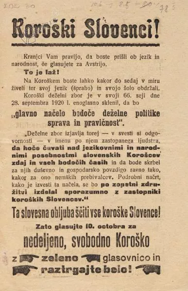 Letak, v katerem so Nemci leta 1920 načrtno lagali Slovencem, da jim bodo "zdaj in vseh bodočih časih" zagotovljene jezikovne in narodne posebnosti. Od javno razglašenih obljub Koroškega deželnega zbora z dne 28. 9. 1920, so ostale le velike laži in zgolj še 2,3 % Slovencev ...